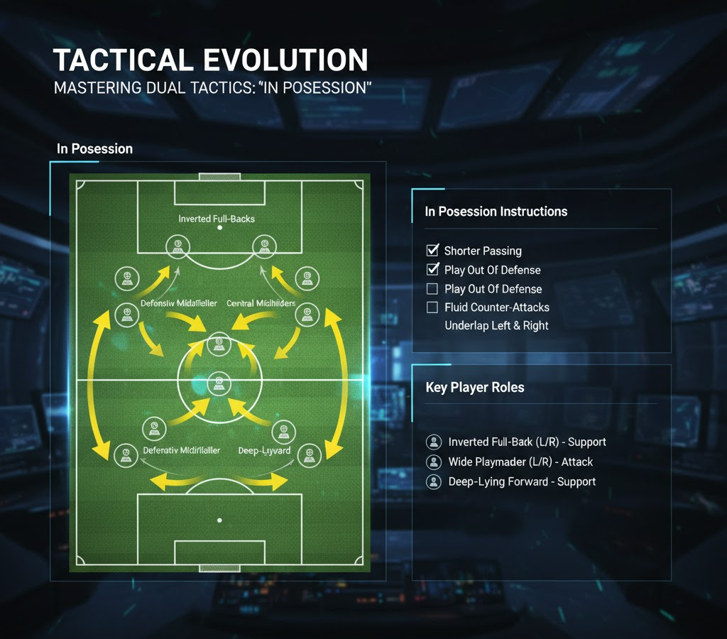 The 'In Possession' structure defines how your team converts its starting formation into an attacking shape. This phase is not simply about scoring goals; it is about controlled build-up and creating optimal space. Consider a standard 4-3-3 formation. In possession, this formation should immediately transform to maximize attacking impact.