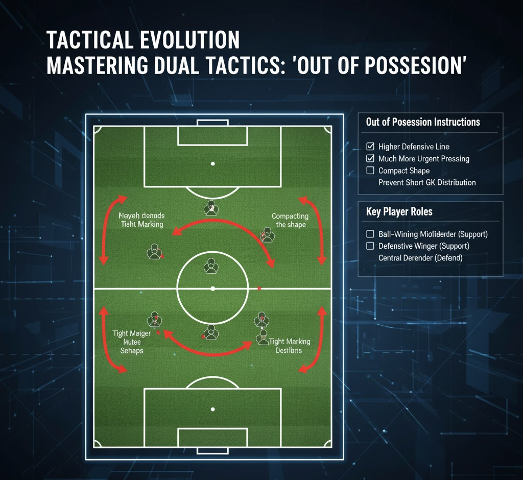 The 'Out of Possession' structure is arguably more critical for consistent success in sport management games. This phase dictates how your team defends space, pressures the ball, and recovers possession efficiently. The attacking 3-2-5 structure must quickly revert to a compact defensive shape.